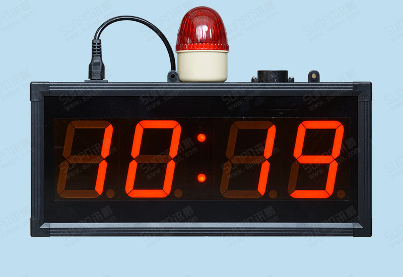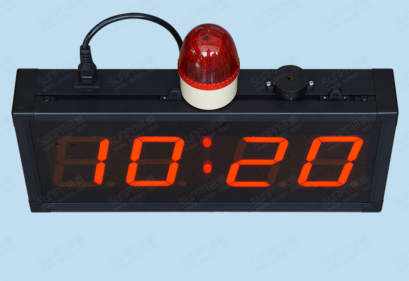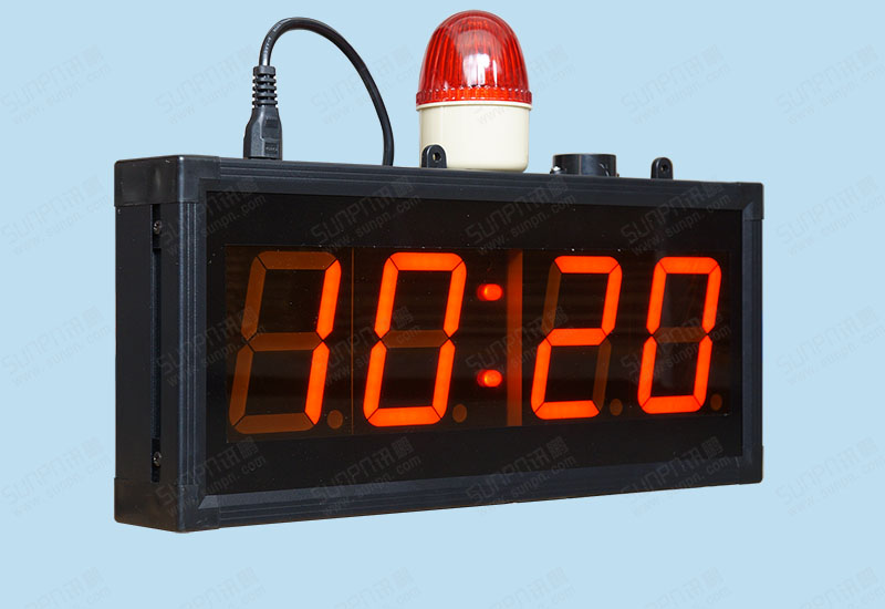 3.倒計時模式下,可通過遙控器設置一個報警時間點和報警時長(0-99秒),如:倒計時間設置為30分鐘,看板顯示 30:00 報警值設置為05:00,即當倒計到05:00時. 蜂鳴器發出嗡鳴聲警燈亮起,持續至所設置的報警時長結束;