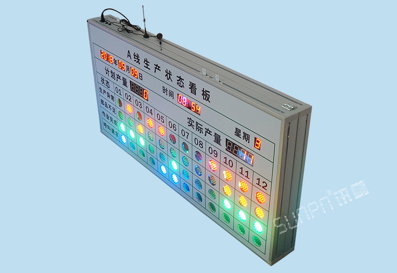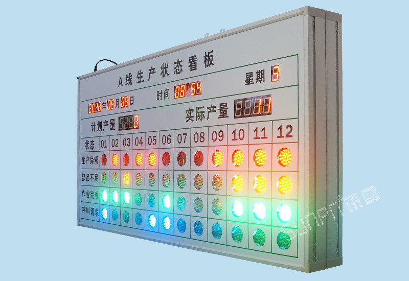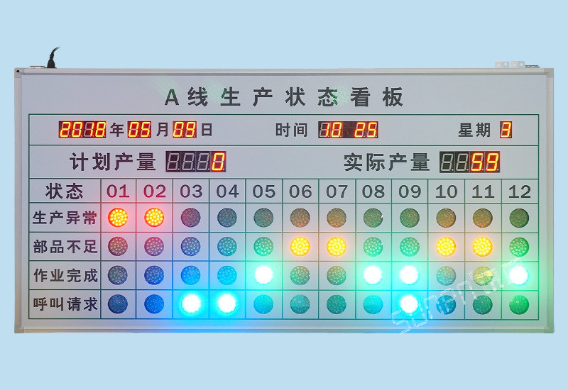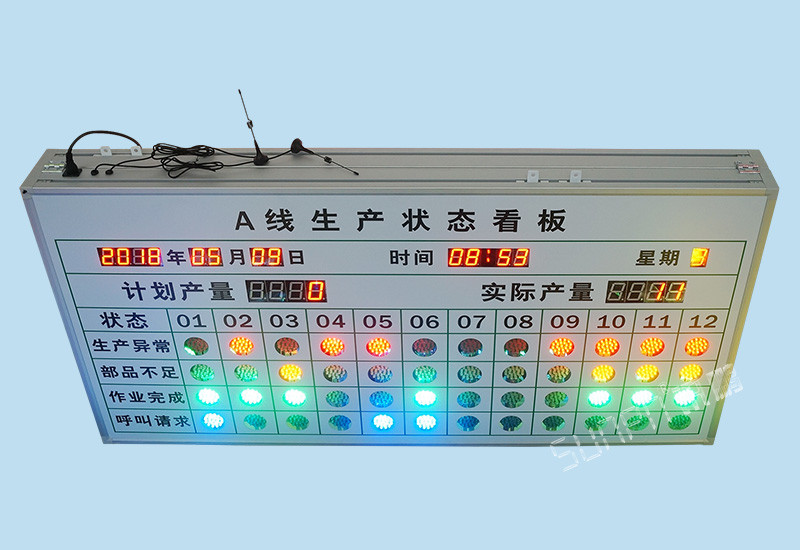 看板配備12個無線按鈕盒,狀態分別為:“生產異常”、“作業完成”、“部品不足”、“呼叫請求”,與看板指示燈對應。