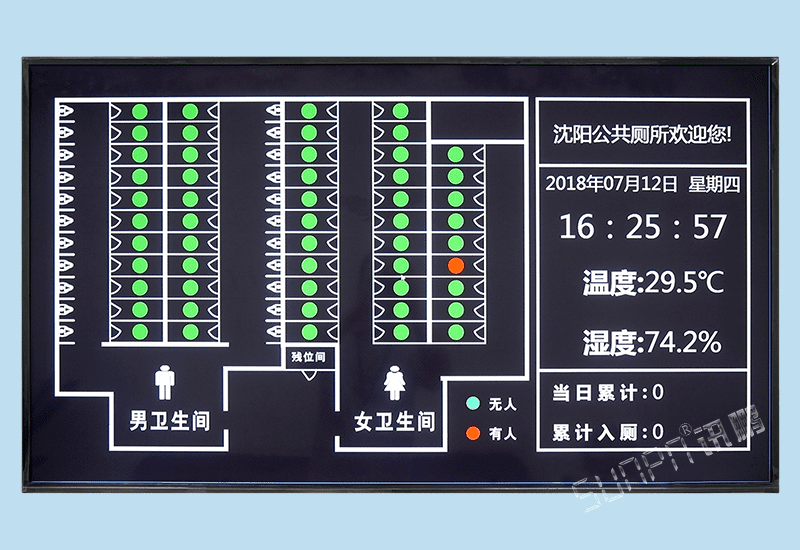 訊鵬智慧公廁使用狀態引導系統廁位使用監測功能:利用紅外探測,對廁位使用情況進行動態監測,反映廁位占用情況,給使用者直觀了解到公廁情況,同時方便管理人員配置資源。