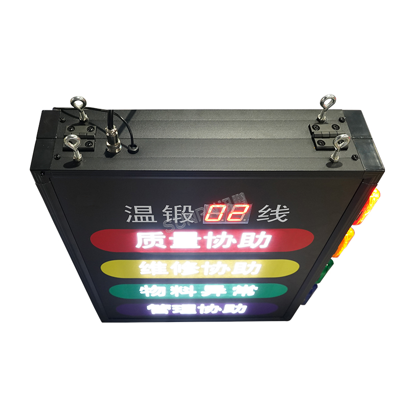 2、邊框為銀色鋁合金邊框,面板、背板采用亞克力材質報警指示燈采用直徑10cm 插燈顯示,顏色分別為黃色、藍色、綠色、紅色,每種顏色都是單色燈