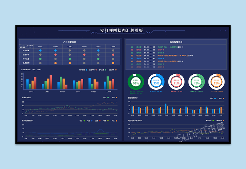 安燈看板顯示可用多種方式呈現,以下是液晶顯示界面,采用液晶顯示界面使頁面數據更直觀,整體數據可在后臺查看,不同的呈現方式讓我們更方便找到想要的數據。