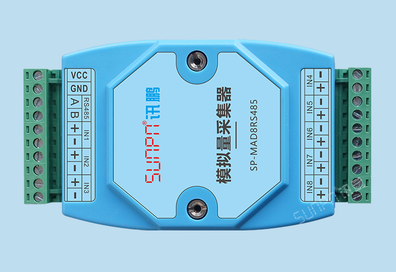 SP-MAD8RS485是-款工業級的模擬量數據采集器產品,8通道差分輸入,采用24位高精度ADC芯片、精度高達土0.1%。RS485通訊接口光電隔離,AD模數接口光電隔,有效抑制干擾;電源及RS485接口均加入防雷保護電路,產品穩定可靠;豐富的指示燈方便調試,運行狀態一目了然;采用標準MODBUS_ RTU協議,同時支持訊鵬配套協議,方便系統集成商、工程商使用;通過RS485即可實現對遠程模擬量設備的數據采集和控制。SP-MAD8RS485廣泛應用于各個系統通常有PLC、工業平板、人機界面、組態軟件,溫濕度傳感器、壓力傳感器、閥門開度、儀器儀表、頻率計數、繼電器開關等。