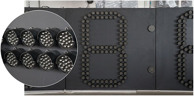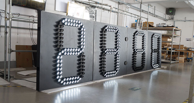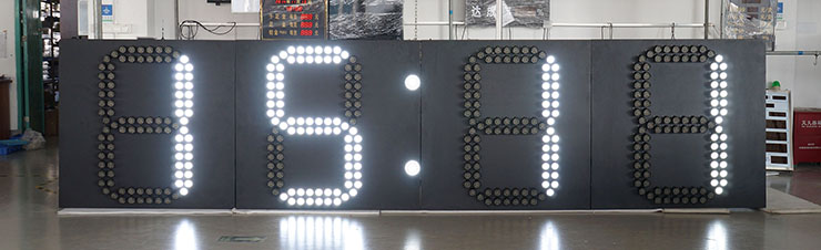 此大型戶外電子鐘顯示尺寸達到45寸,總長5米,高1.2米,單一個8字就由98個52mm的LED像素筒組成,并達到戶外IP65的防護等級。時間方面采用最先進的GPS校時,并可根據環境光自動調節其亮度和通過遙控器按8個等級設置電子鐘的亮度。是訊鵬科技數字顯示的精品之作。此次訂單在訊鵬科技外貿部、工程部、生產部等各部門的緊密合作下,克服種種困難,歷時半個月按質按量完成,比預計交貨期提前一個星期,得到泰方客戶的高度評價并與之確立了良好的長期合作關系。相信此次合作將為訊鵬科技拓展泰國的LED市場取到至關重要的作用。
