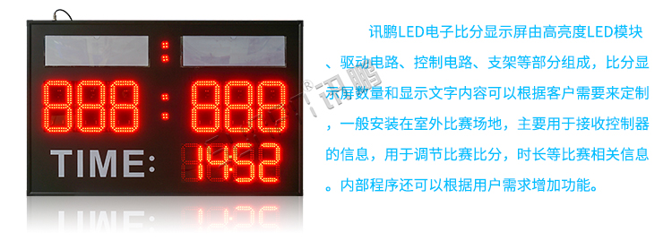 大多數比賽中都需要向觀眾和選手展示比賽得分情況,需要用到LED電子記分牌。在目前市場上,普通的記分牌系統都需要很高的價格。但是經過訊鵬的定制研發,我們設計的LED電子記分牌,電路簡單,成本較低,靈敏可靠,操作方便,具有很高的使用價值。